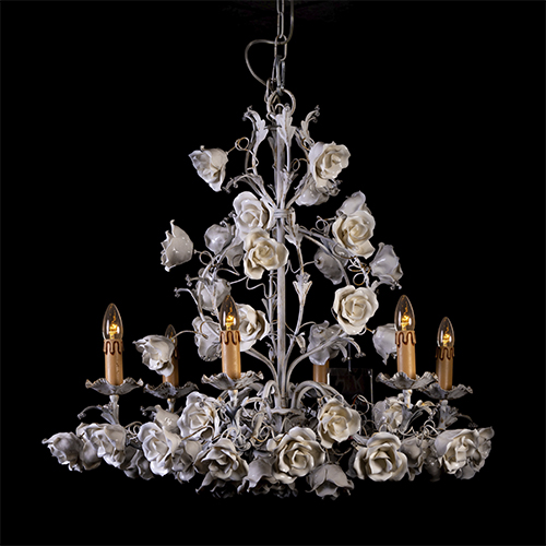 Люстра с шестью лампами в форме свеч Art. 14700/6C-W — нежная композиция, которая очаровывает с первой встречи. Дизайнеры итальянской компании Stillux оставили традиционную форму настенных светильников и украсили их декоративными цветами. Они изготовлены вручную из фарфора. Букет роз выложен по низу светильника и переплетен вдоль центральной опоры.