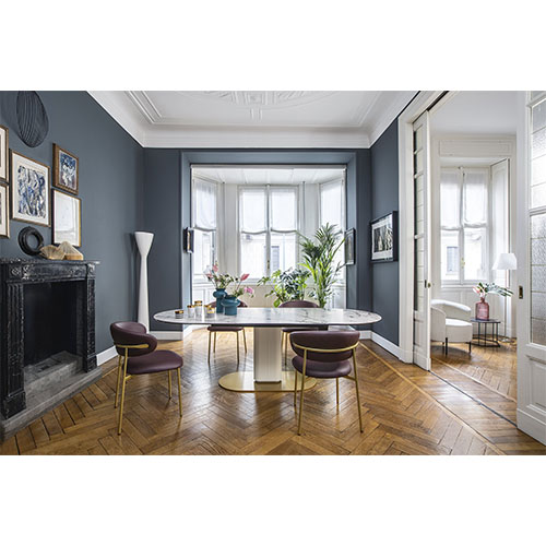 Изящное металлическое основание с двойным покрытием и столешницей из итальянской стеклокерамики создает современный контраст материалов.