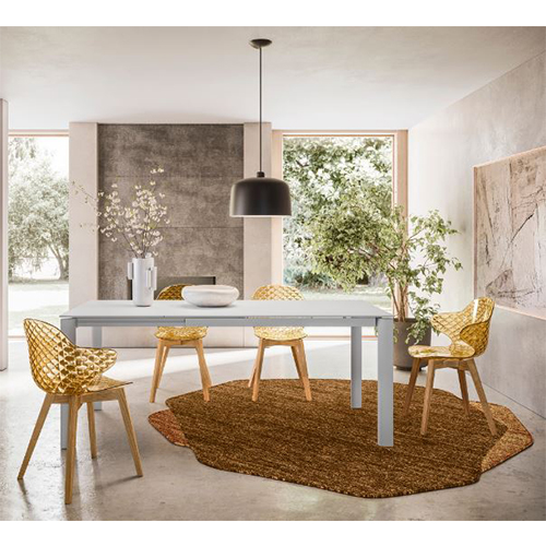 Ножки, изготовленные методом субтракции и шлифовки, они позволяют отказаться от привычных угловых, треугольных, квадратных или прямоугольных секций, характерных практически для всех подобных столов. Большое расстояние между внутренними углами не только наглядно демонстрирует удобство сидения и пространство для ног, но и придаёт столу лёгкий и динамичный силуэт. Он обладает простым, но мгновенно узнаваемым дизайном. Тонкие длинные ножки поддерживают универсальную раздвижную столешницу, доступную в различных материалах и отделках.Раскладной стол с полуавтоматическим механизмом (аналог стол Duca или Baron).